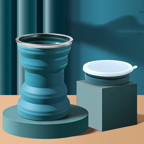 Faltbarer Silikonbecher mit Kunststoffdeckel zum mitnehmen und Reisen
