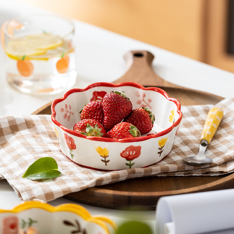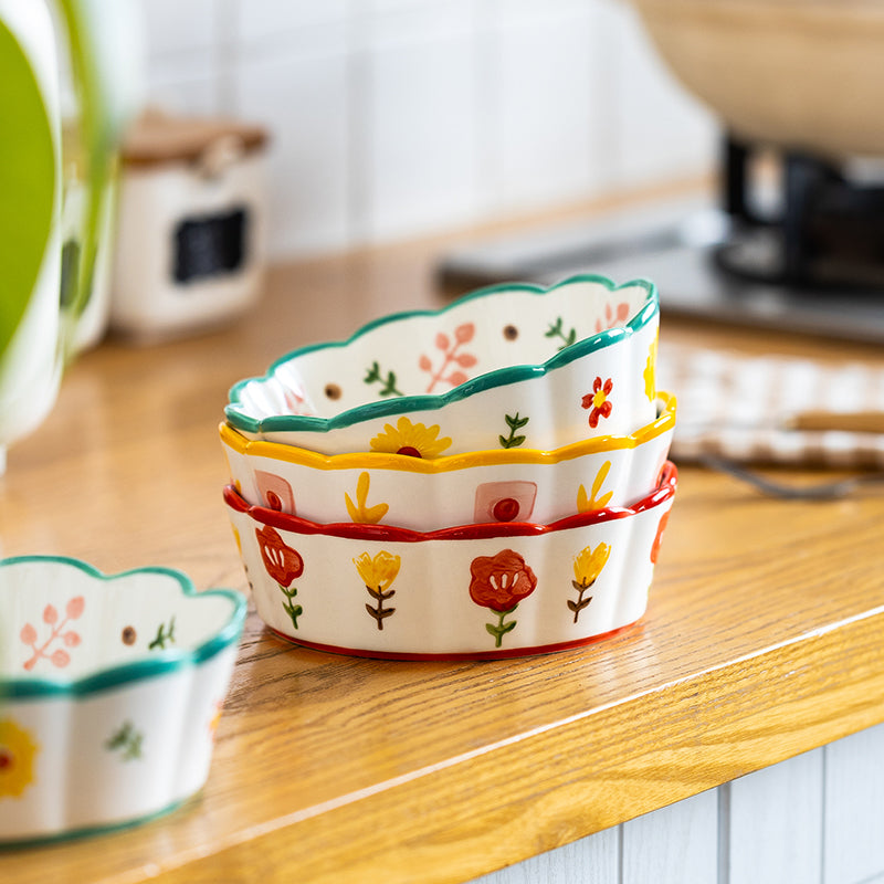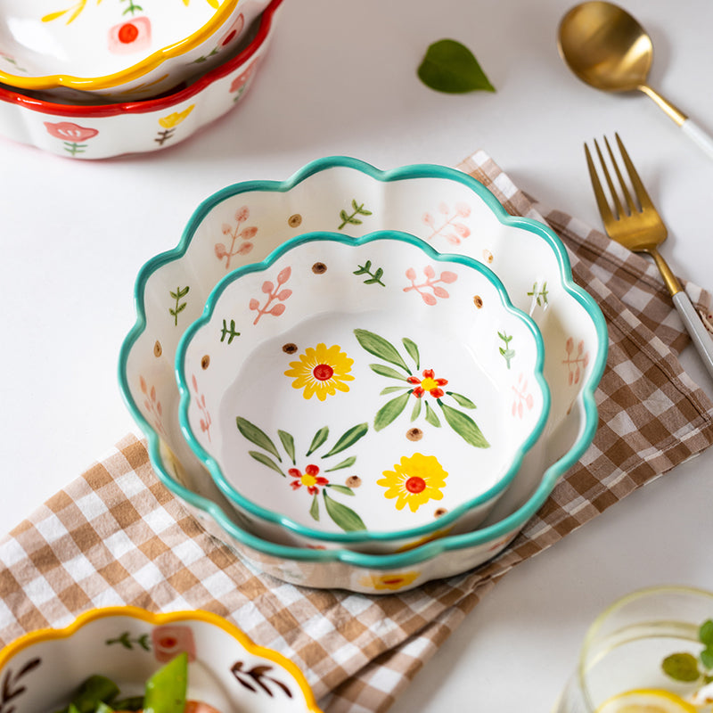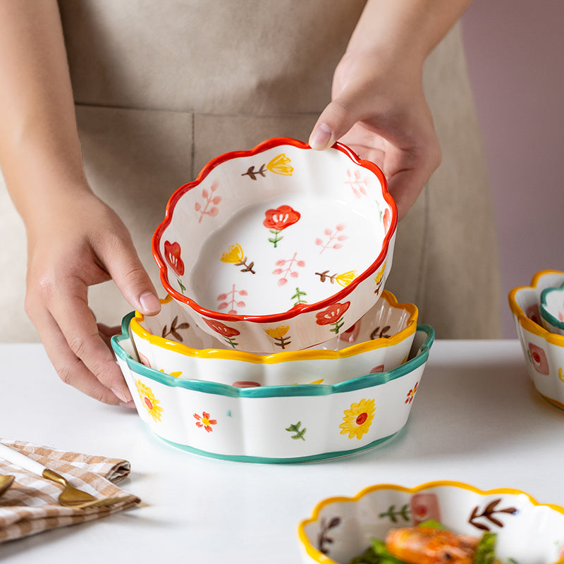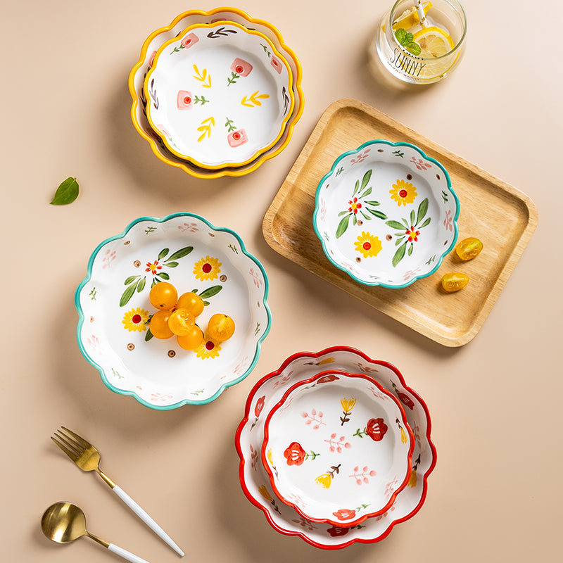 Entdecke unsere modernen Keramikschüsseln in einfachen Stil, verziert mit bunten Blumen und Blüten. Die Schalen überzeugen durch ihre hohe Qualität, zeichnen sich durch absolute Geruchs- und Geschmacksneutralität aus und sind zudem geeignet in Mikrowellen und Spülmaschinen. Sie können sie vor oder während des Kochens zum zwischenzeitlichen Aufbewahren von Gemüse oder Fleisch verwenden, Pudding darin anrühren, Teig darin kneten oder Klösse formen, als Obstschale verwenden und vieles mehr.