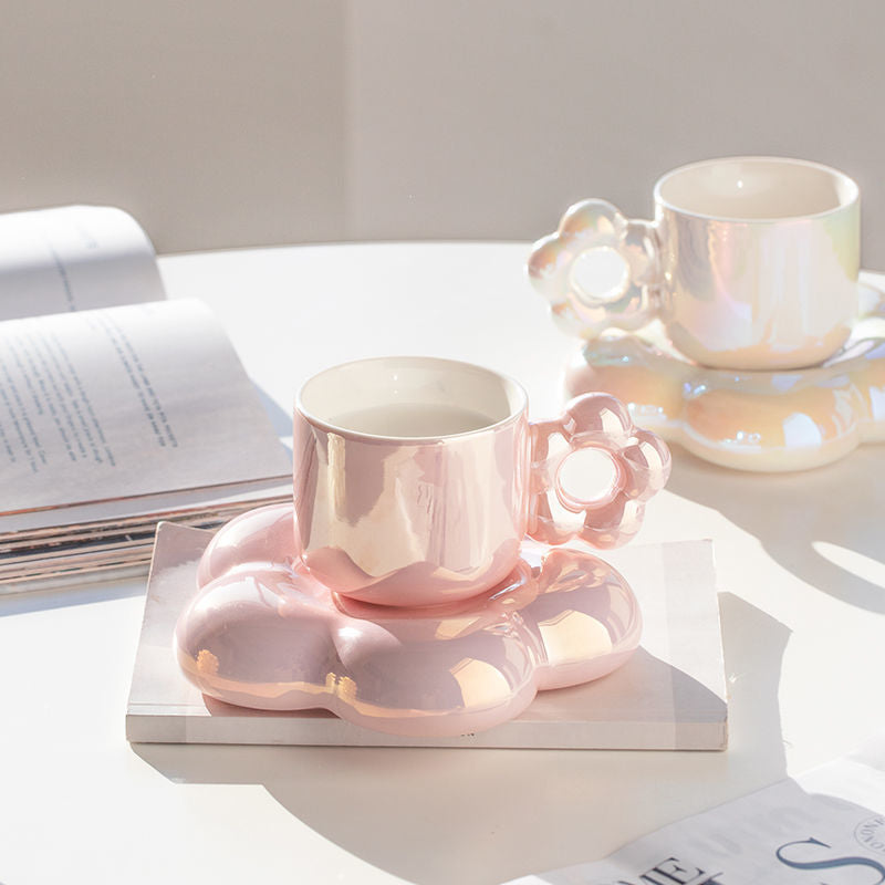Perfekt geeignet für Tassen- und Blumenliebhaber! Handgemachte Tasse in floralem Design. Die glänzende Glasur ist innen und außen der Tasse beschichtet, und macht die Tasse glänzender und hübscher. Der Tassenhenkel und die Untertasse sind beide in Form einer Blume und ergänzen sich damit zu einem perfekten Set. Die lebendige und glitzer-schimmernde Farbe animiert dazu den Tag mit einem Lächeln zu beginnen.
